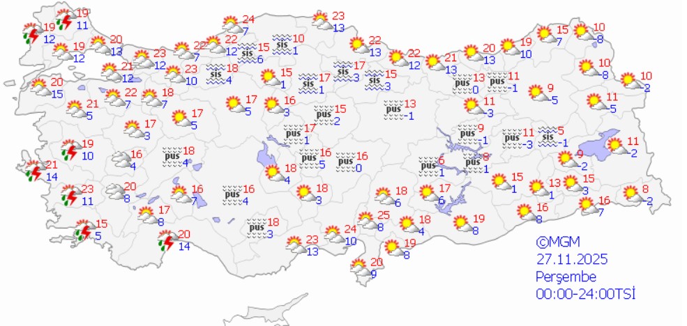 • 28 Kasım Cuma: Gök gürültülü sağanaklar geniş alanda etkili.