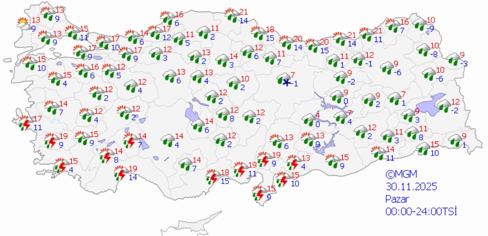29 Kasım Cumartesi: Marmara ve batıda sağanak, iç kesimlerde hafif kar.