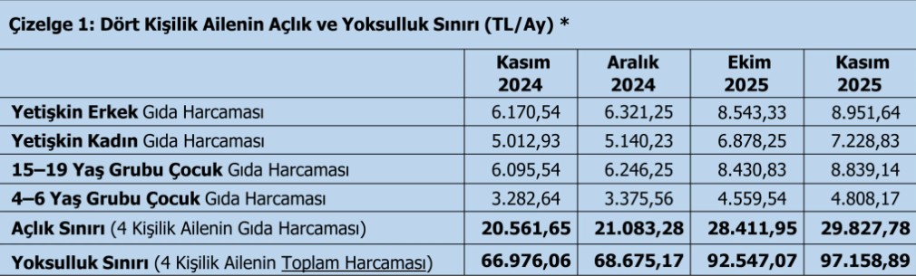 Gıda harcamalarının yanı sıra kira, fatura, ulaşım, eğitim ve sağlık giderlerinin eklenmesiyle dört kişilik bir ailenin aylık yoksulluk sınırı 97.158,89 TL olarak hesaplandı. Bu rakam, bir hanenin insana yakışır bir yaşam sürdürebilmesi için gerekli toplam geliri ifade ediyor.