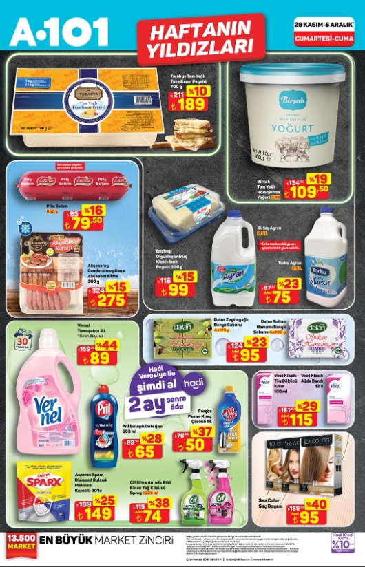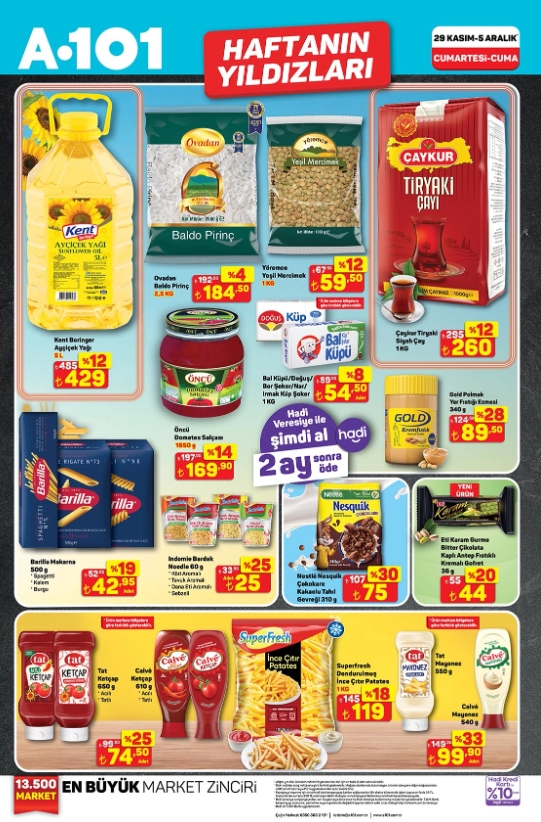 A101, 29 Kasım – 5 Aralık tarihleri arasında geçerli yeni “Haftanın Yıldızları” kataloğunu yayımladı. Ayçiçek yağından makarnaya, yoğurttan dondurmaya, şampuandan temizlik ürünlerine kadar yüzlerce üründe dikkat çeken indirimler tüketicilerin ilgisini çekti.