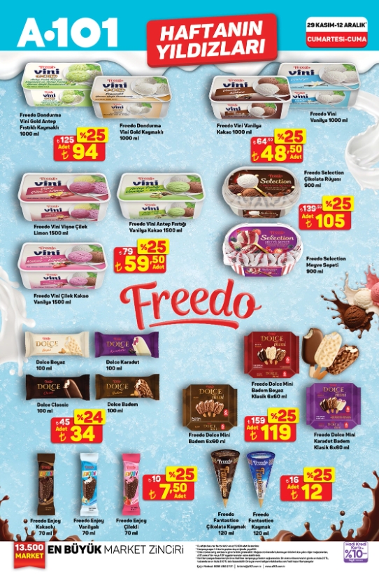 A101’in bu haftaki kampanyası hem temel gıda hem de dondurma ve temizlik ürünlerinde geniş bir yelpaze sunuyor. Özellikle Torku Banada, Superfresh ürünleri ve Freedo dondurma çeşitleri tüketiciler tarafından yoğun ilgi görmesi beklenen ürünler arasında.