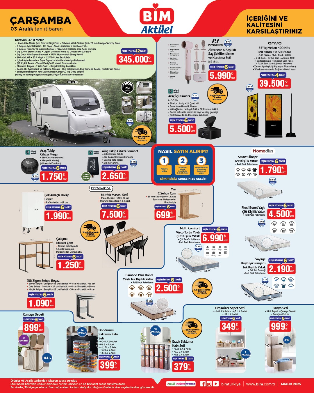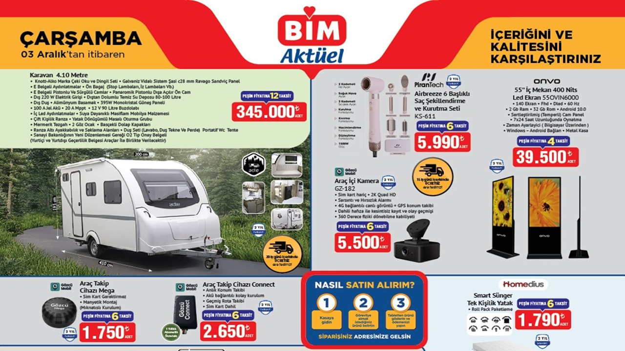 BİM, 3 Aralık Çarşamba gününden itibaren geçerli olacak yeni aktüel ürünler kataloğunu duyurdu. Karavan, televizyon, akıllı cihazlar, mobilya ve yatak çeşitleri dâhil geniş ürün yelpazesi tüketicilerden büyük ilgi gördü.