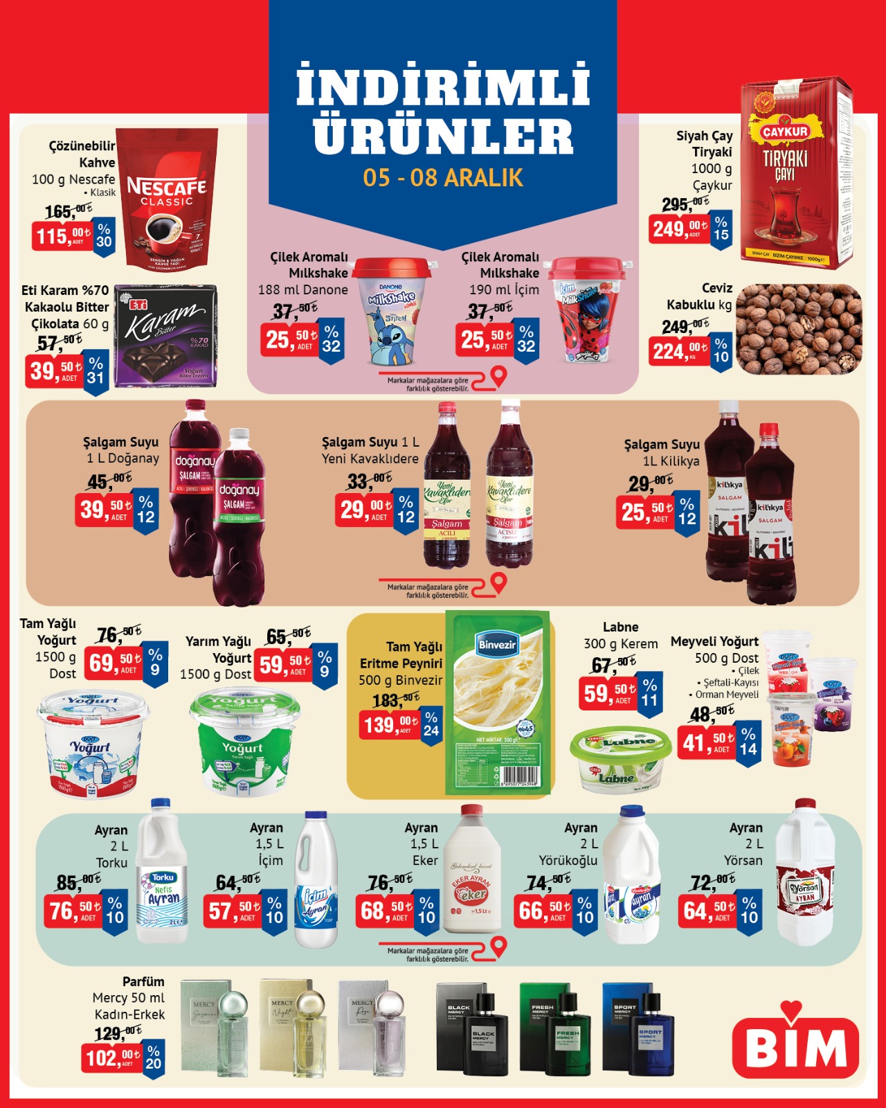 BİM, 5–8 Aralık tarihleri arasında geçerli indirim kampanyasıyla temel gıdadan içeceklere, süt ürünlerinden kişisel bakım ürünlerine kadar birçok kalemde fiyatları aşağı çekti. İndirimli ürünler stoklarla sınırlı olarak satışa sunuluyor.