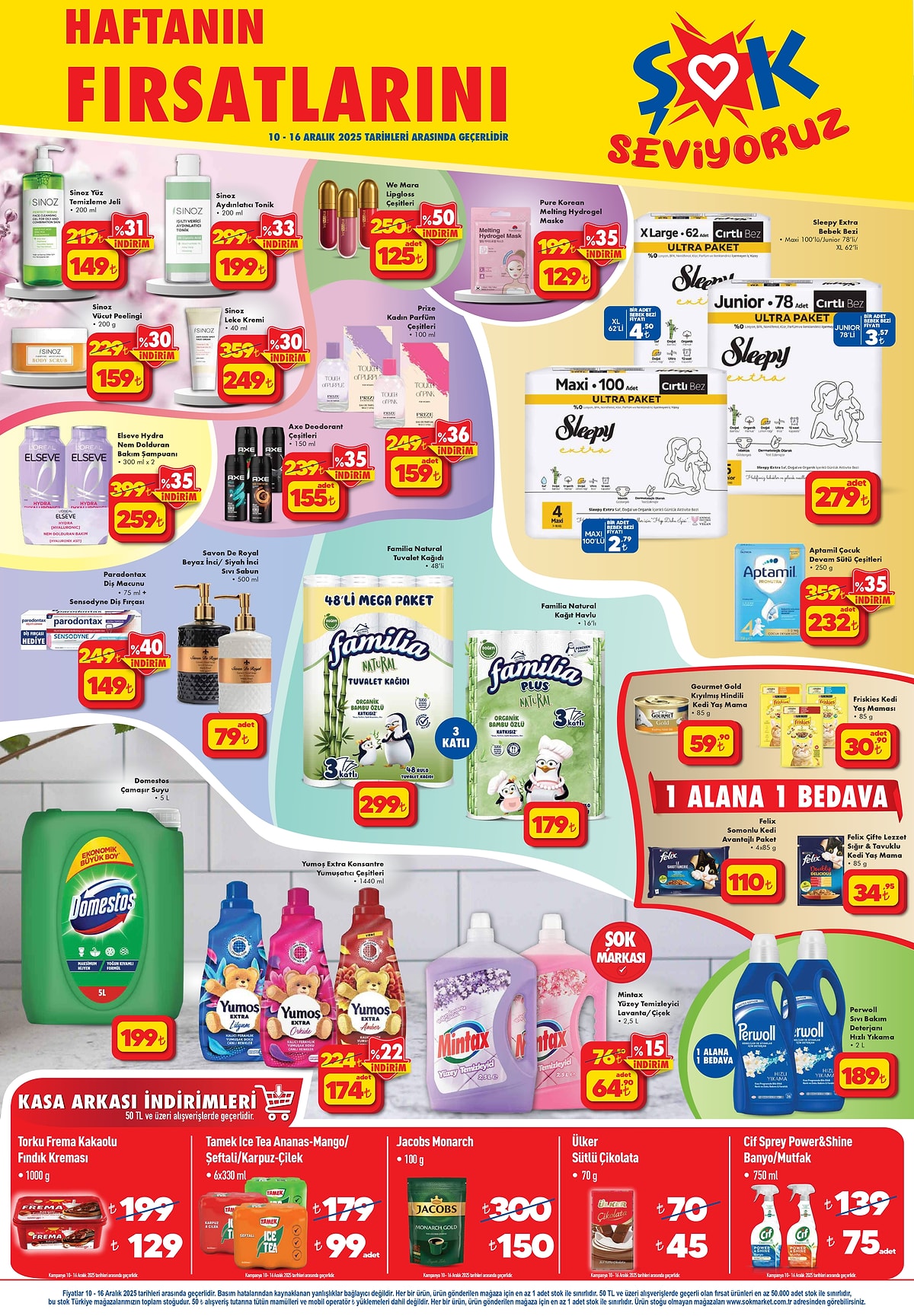 ŞOK Market, 10-16 Aralık tarihleri arasında ev ihtiyaçlarınızı uygun fiyatlarla karşılamanızı sağlıyor. Özellikle tuvalet kağıdı ve kağıt havlu gibi temel ürünlerdeki büyük indirimler dikkat çekiyor. Haftanın fırsatlarıyla, temizlik ve kişisel bakım ürünlerinden bebek bezine kadar birçok üründe avantajlı fiyatlarla alışveriş yapabilirsiniz. Bu fırsatları kaçırmamak için ŞOK Market’e uğrayın!