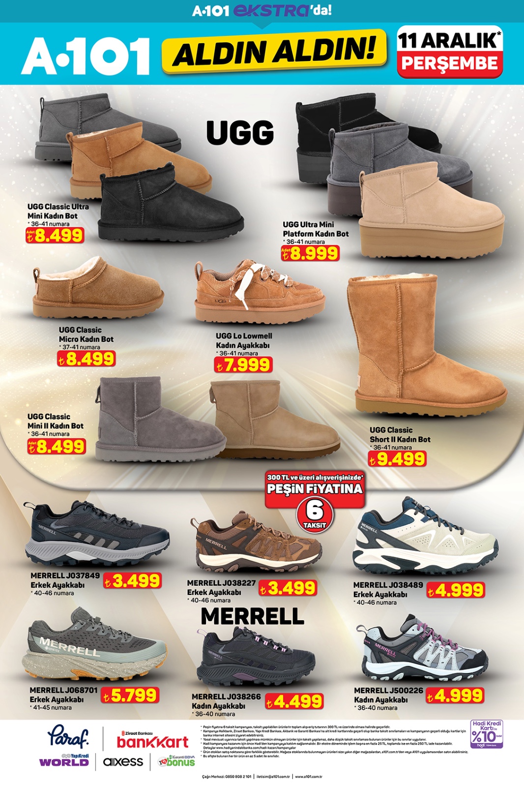 A101, 11 Aralık Perşembe günü geçerli olacak yeni Aldın Aldın kataloğunu yayımladı. Bu hafta katalog; kış sezonunun en çok tercih edilen markalarından UGG ve outdoor tutkunlarının gözdesi Merrell ayakkabı çeşitleri ile dikkat çekiyor. Hem kadın hem erkek modellerinde sunulan indirimler, özellikle soğuk havaların etkisini artırdığı bu dönemde yoğun ilgi görmeye aday.