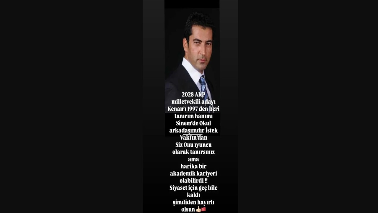 “2028 AK Parti milletvekili adayı Kenan’ı 1997’den beri tanırım. Okul arkadaşımdır. Siz onu oyuncu olarak tanırsınız ama akademik bir kariyeri de olabilirdi. Siyaset için geç bile kaldı. Şimdiden hayırlı olsun.”