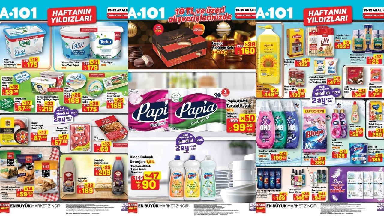 A101 Market, Aralık ayının yeni indirim dönemini duyurdu. 11–14 Aralık “Tazenin Yıldızları” kampanyasıyla taze gıda ürünlerinde çarpıcı fiyatlar sunan market zinciri, 13–19 Aralık “Haftanın Yıldızları” kapsamında süt ürünlerinden deterjana, kişisel bakımdan kahvaltılıklara kadar geniş bir yelpazede büyük indirimler uyguluyor. İşte bu hafta A101’e uğramak için en güçlü nedenler ve raflarda öne çıkan tüm ürünler…