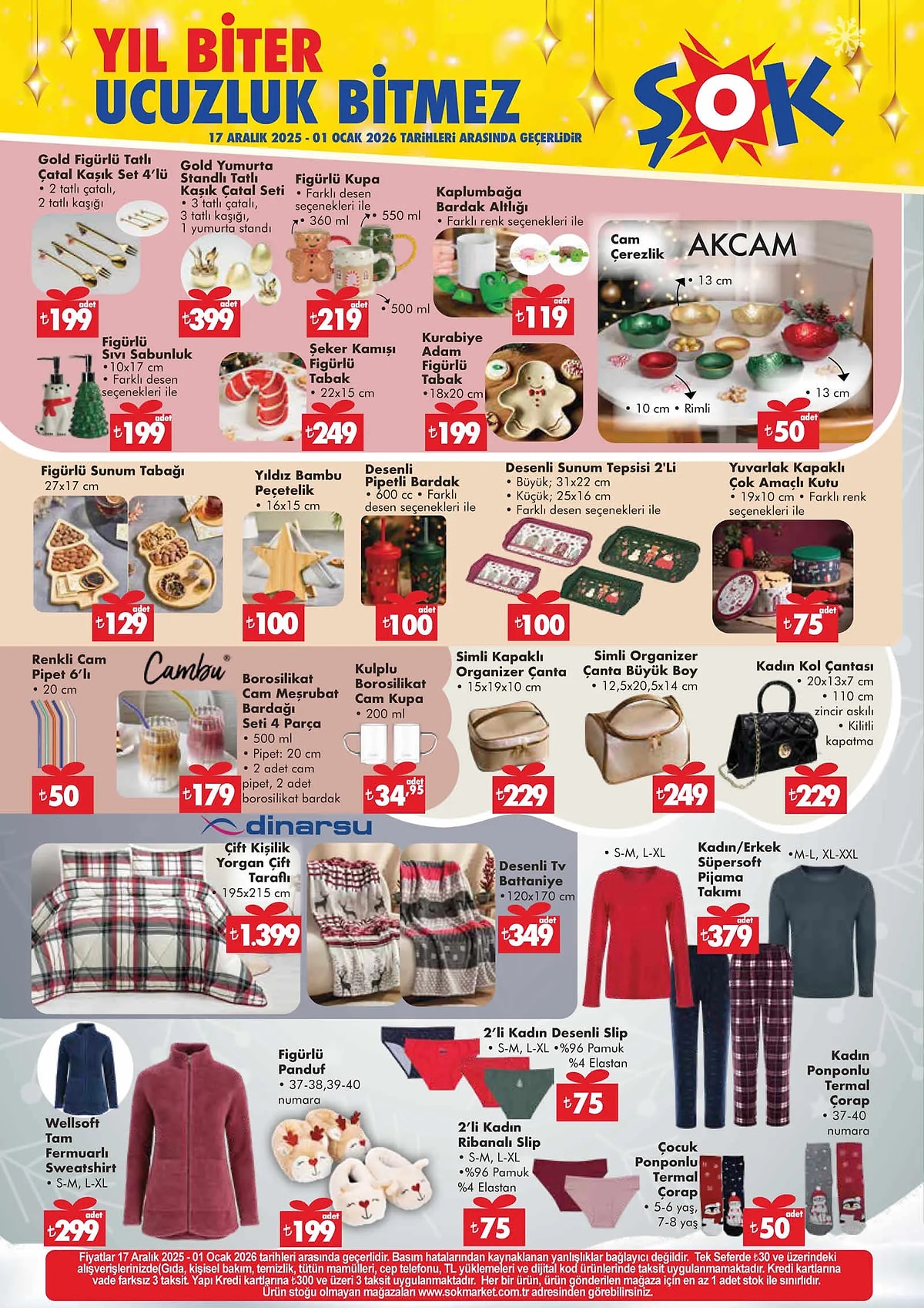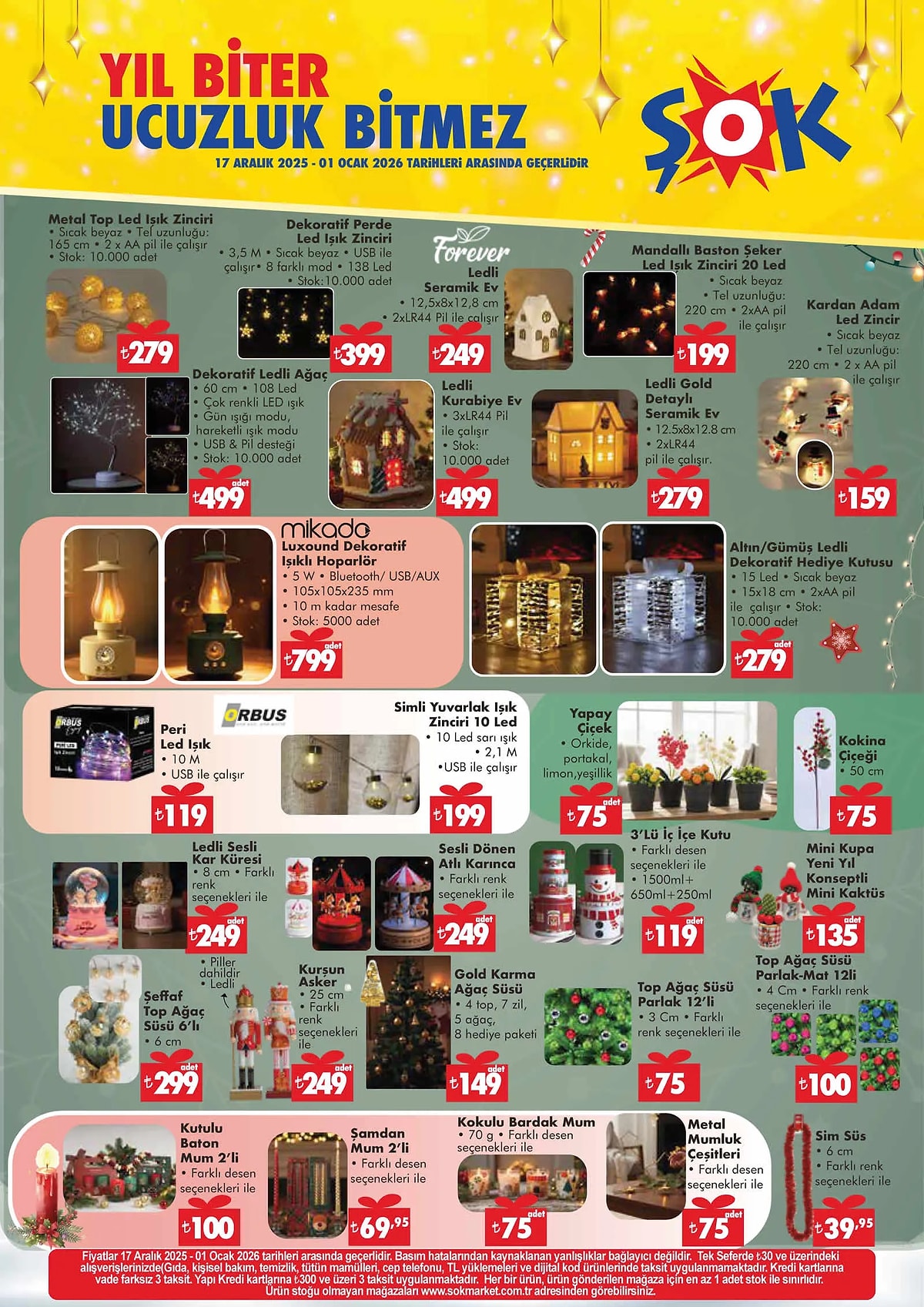 ŞOK Market’in yıl sonu kampanyası; hediyelik, dekoratif ürünler, gıda, kişisel bakım, oyuncak ve ev tekstilinde geniş ürün gamı ve cazip fiyatlarıyla tüketicilerin ilgisini çekiyor. Kampanya 1 Ocak 2026’ya kadar tüm ŞOK mağazalarında geçerli olacak.