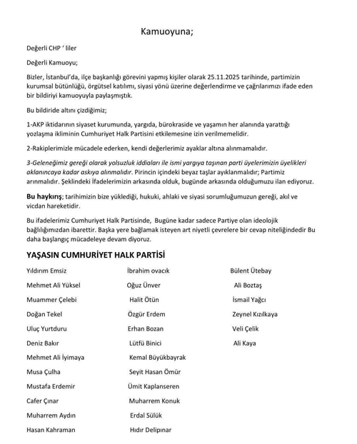 Muammer Çelebi açıklamasında, İstanbul’da ilçe başkanlığı yapmış isimler olarak 25 Kasım 2025 tarihinde CHP’nin kurumsal bütünlüğü, örgütsel katılımı ve siyasi yönü üzerine ortak bir bildiri yayımladıklarını hatırlattı. Bu bildirinin arkasında olduklarını vurgulayan Çelebi, şu ifadeleri kullandı: