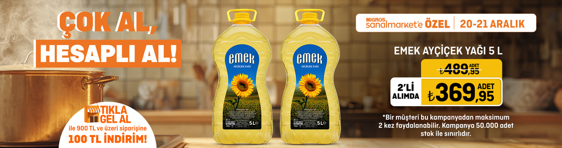 Migros Sanal Market, yıl sonu kampanyaları kapsamında ayçiçek yağı ve zeytinyağında dikkat çeken indirimlere imza attı. Emek Ayçiçek Yağı 5 litre ürünü, 20–21 Aralık tarihlerinde 2’li alımda sepette 120 TL’ye varan indirimle satışa sunuldu.