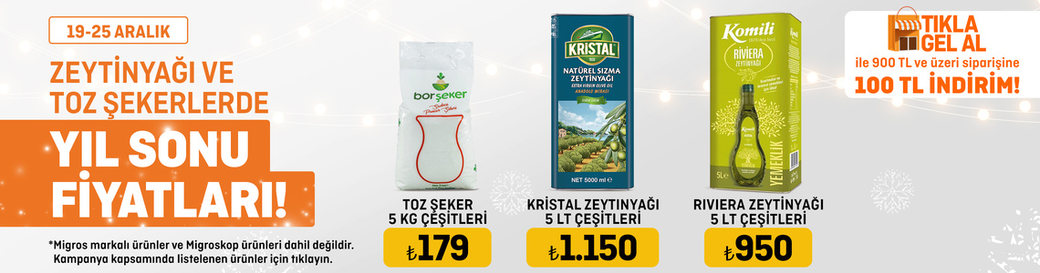 Migros’un 19–25 Aralık tarihleri arasında geçerli ikinci kampanyasında ise zeytinyağı ve toz şeker ürünleri öne çıkıyor.
