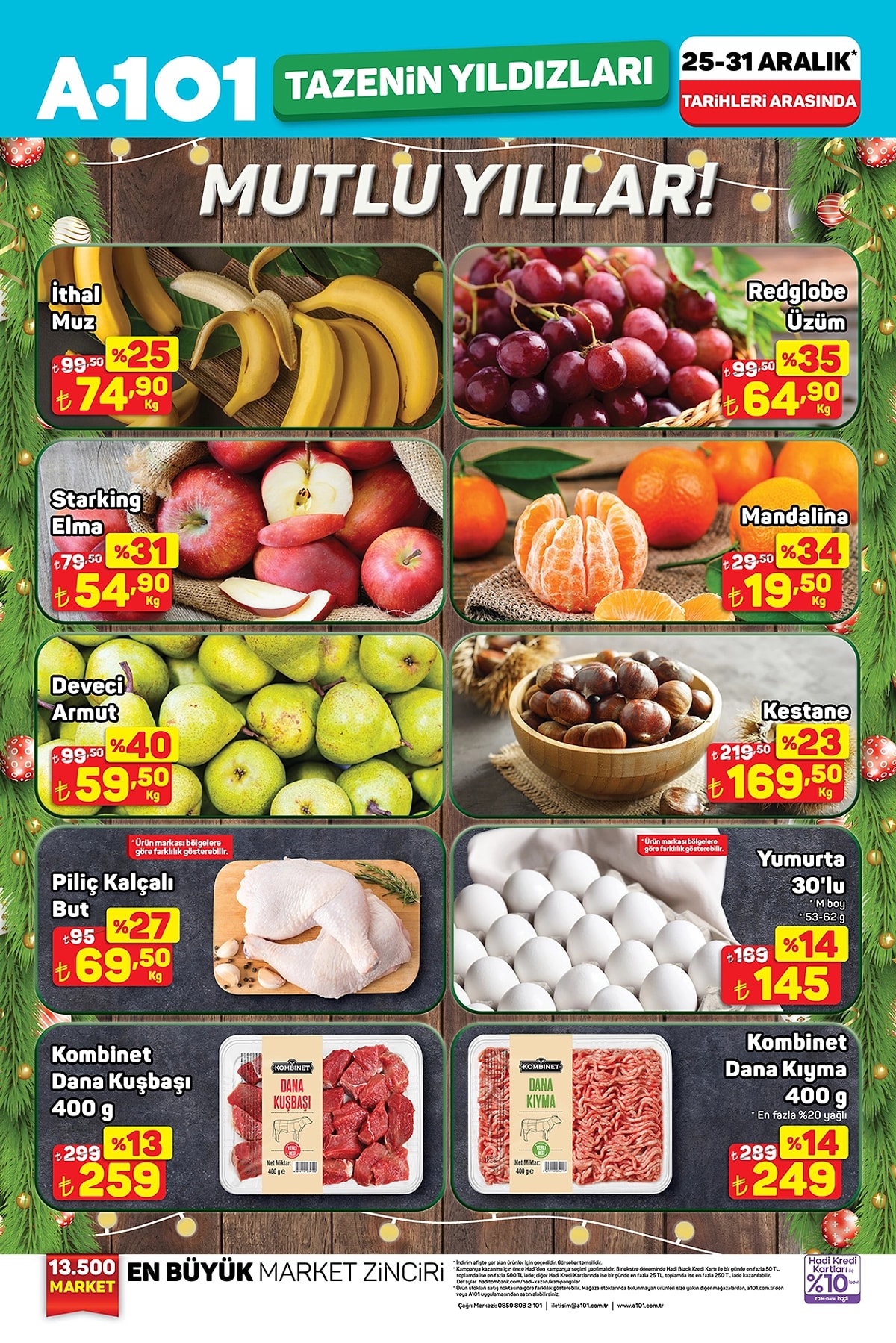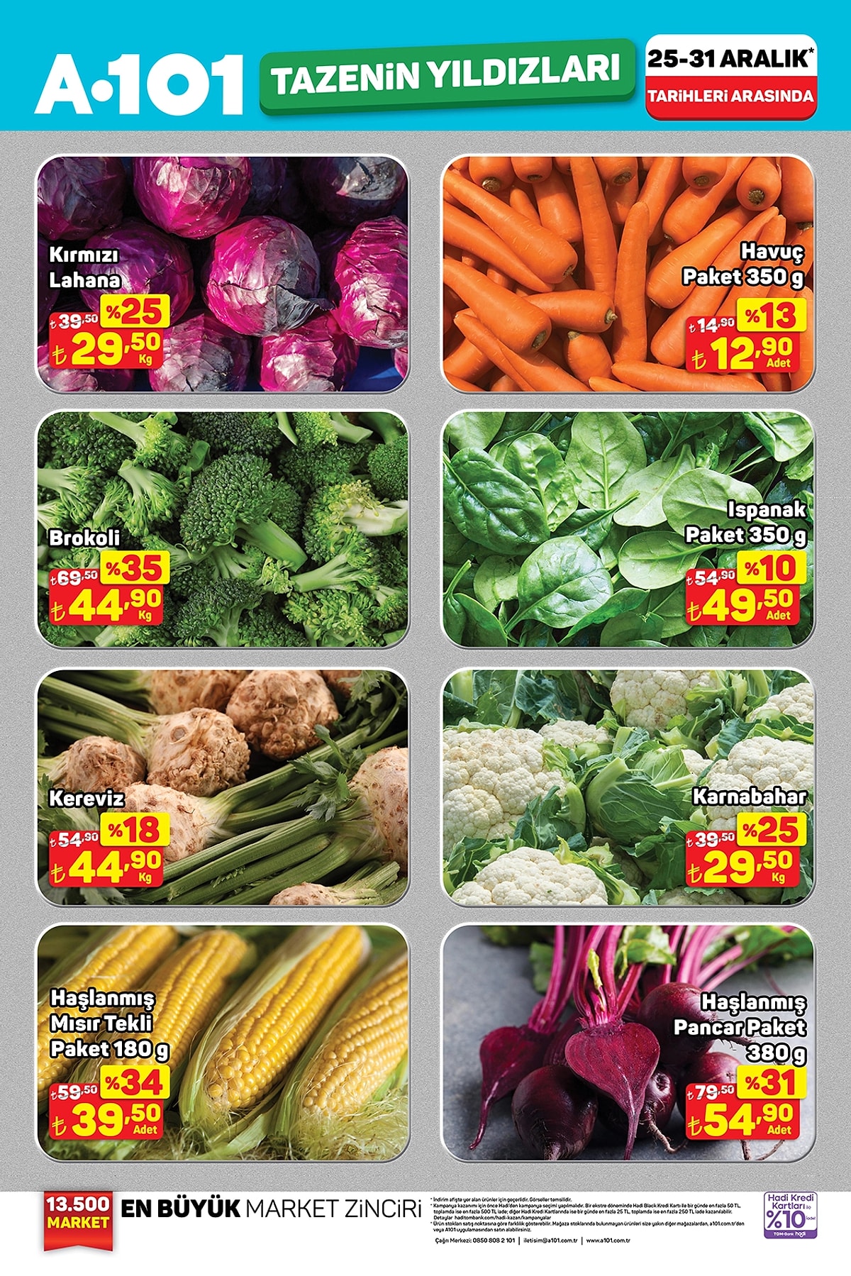 Türkiye genelindeki mağazalarında kampanya atağına geçen A101, 27 Aralık – 2 Ocak tarihleri arasında geçerli olacak yeni indirim kataloğunu duyurdu. Gıdadan temizlik ürünlerine, manav reyonundan atıştırmalıklara kadar geniş bir ürün yelpazesinde yapılan indirimler, yıl sonu alışverişi yapacak tüketicilerin ilgisini çekti.