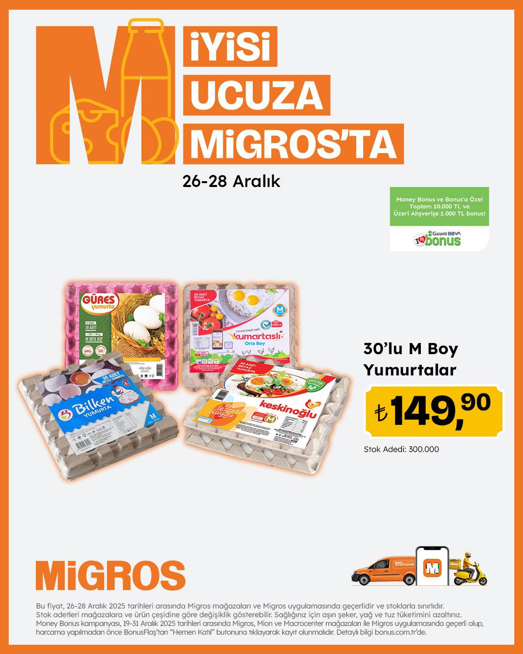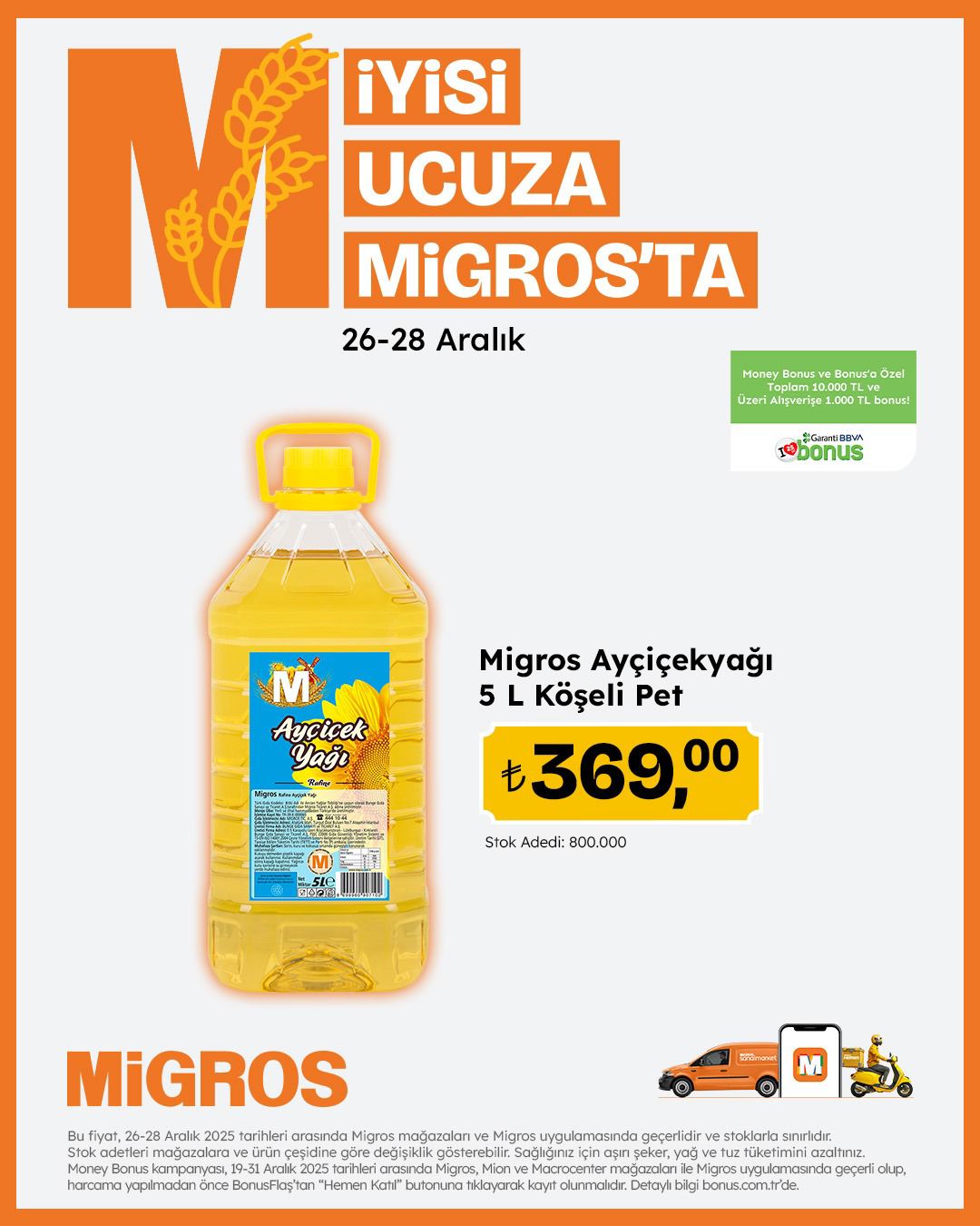 Migros, yılın son günlerinde temel gıda ürünlerinde yeni bir kampanya başlattı. 26–28 Aralık tarihleri arasında geçerli indirimlerde ayçiçek yağı ve yumurta fiyatları öne çıktı.
