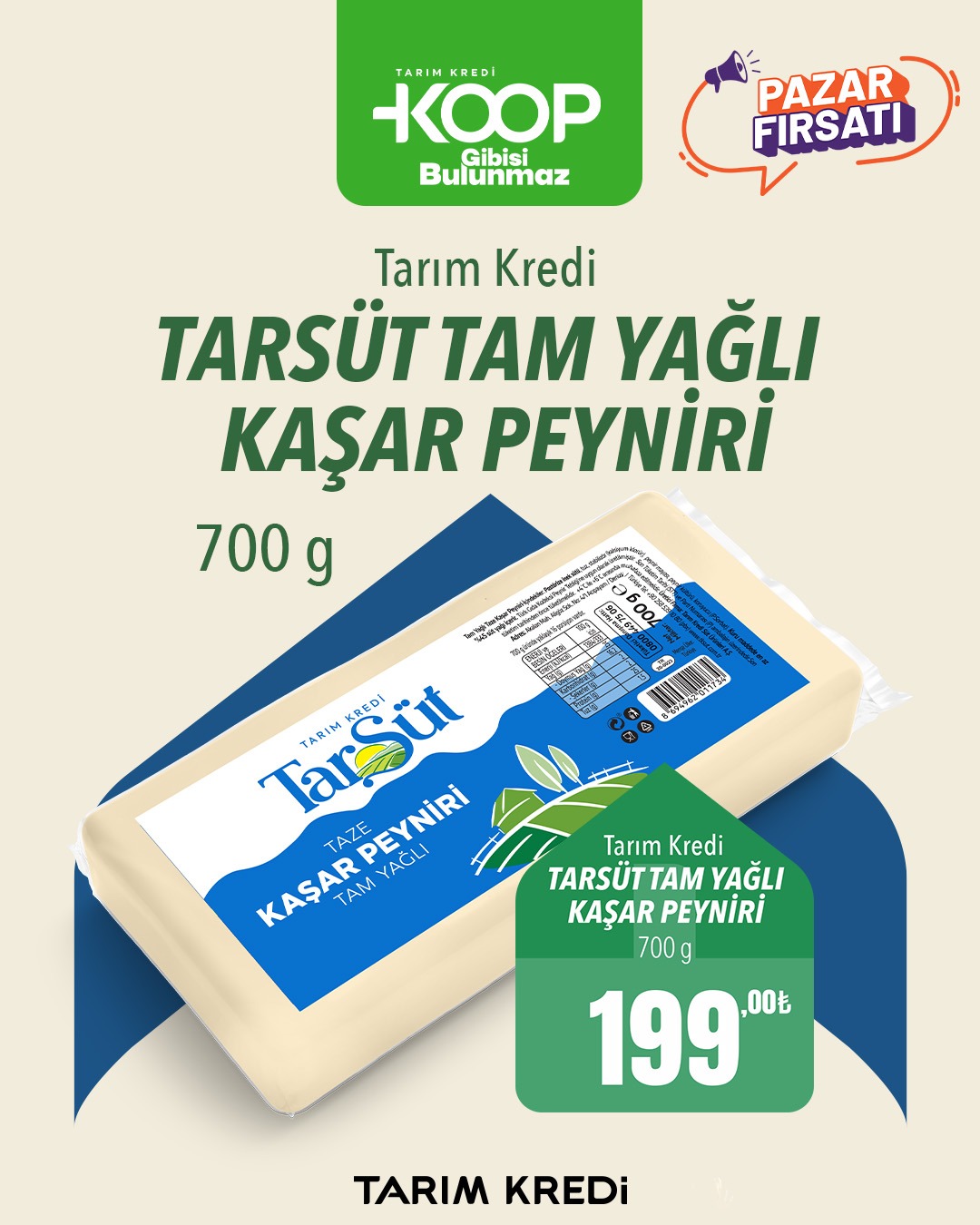 Tarım Kredi Kooperatif Marketleri, pazar fırsatları kapsamında temel gıda ürünlerinde yeni bir kampanyayı duyurdu. Tarsüt tam yağlı kaşar peyniri için açıklanan fiyat, tüketicinin dikkatini çekti.