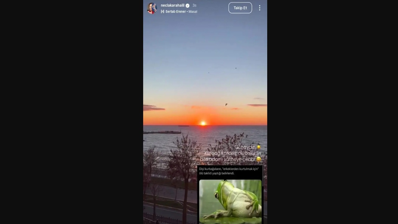 Cem Yılmaz ile geçtiğimiz yıl yollarını ayıran Necla Karahalil, isim vermeden dikkat çeken bir paylaşım yaptı. Karahalil, dişi kurbağaların erkeklerden kurtulmak için “ölü taklidi yaptığı” yönündeki bir haberi paylaşarak, “Kurbağa kardeş, ölü taklidin bile adamı sahneye çıkarır” ifadelerini kullandı.