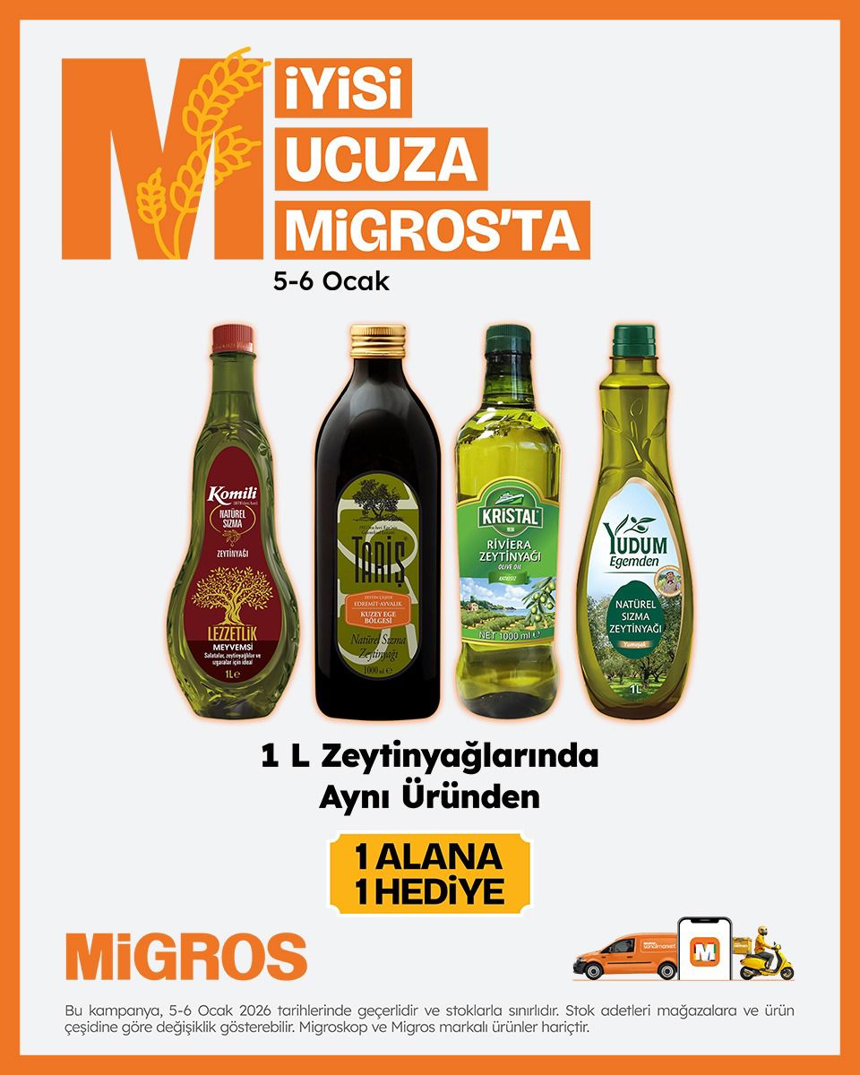 Migros, 5–6 Ocak tarihlerine özel yeni kampanyasını duyurdu. Kampanya kapsamında 1 litrelik zeytinyağı ürünlerinde “aynı üründen 1 alana 1 hediye” fırsatı tüketicilerle buluştu.